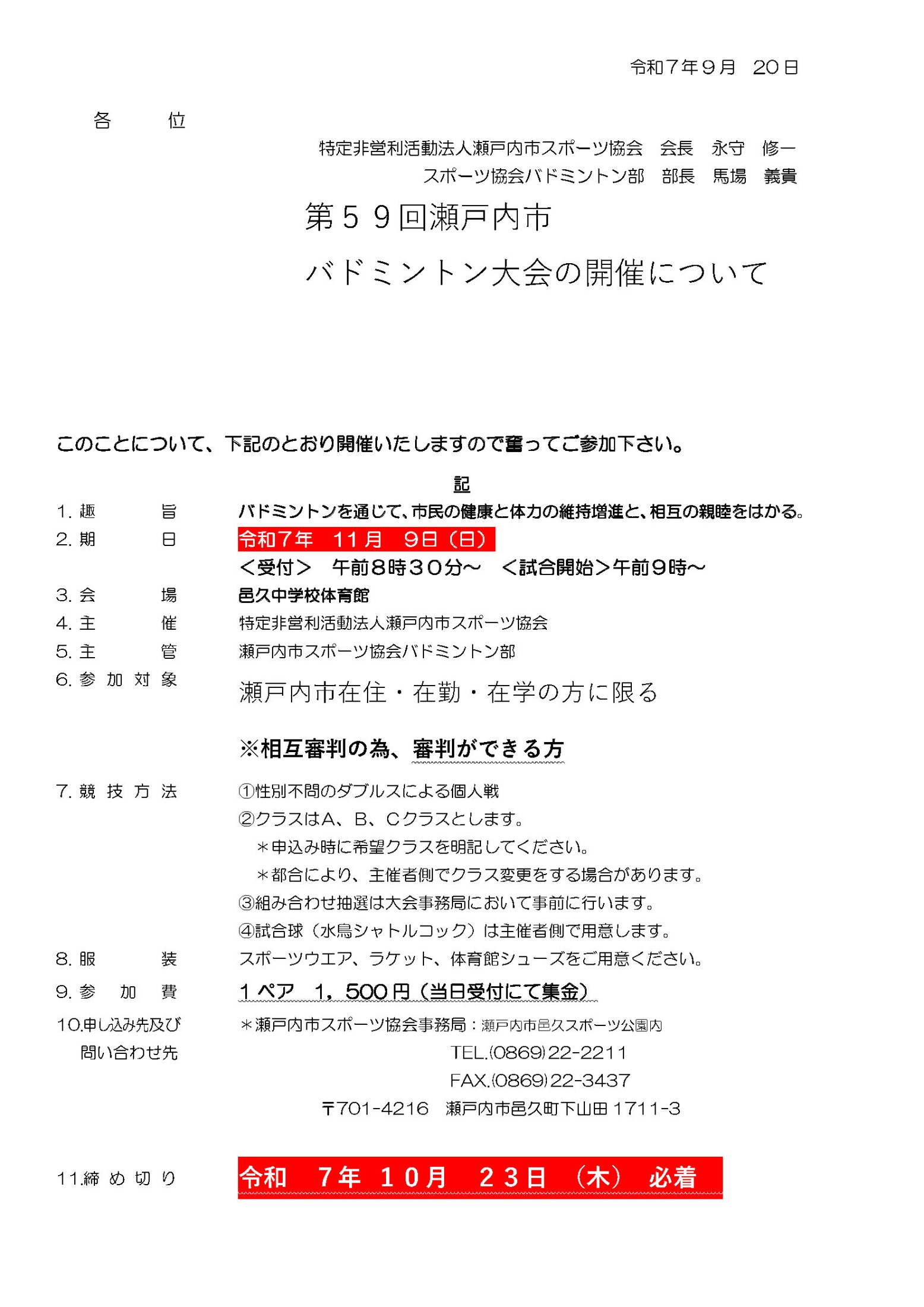 第59回瀬戸内市バドミントン大会の要項と申込書