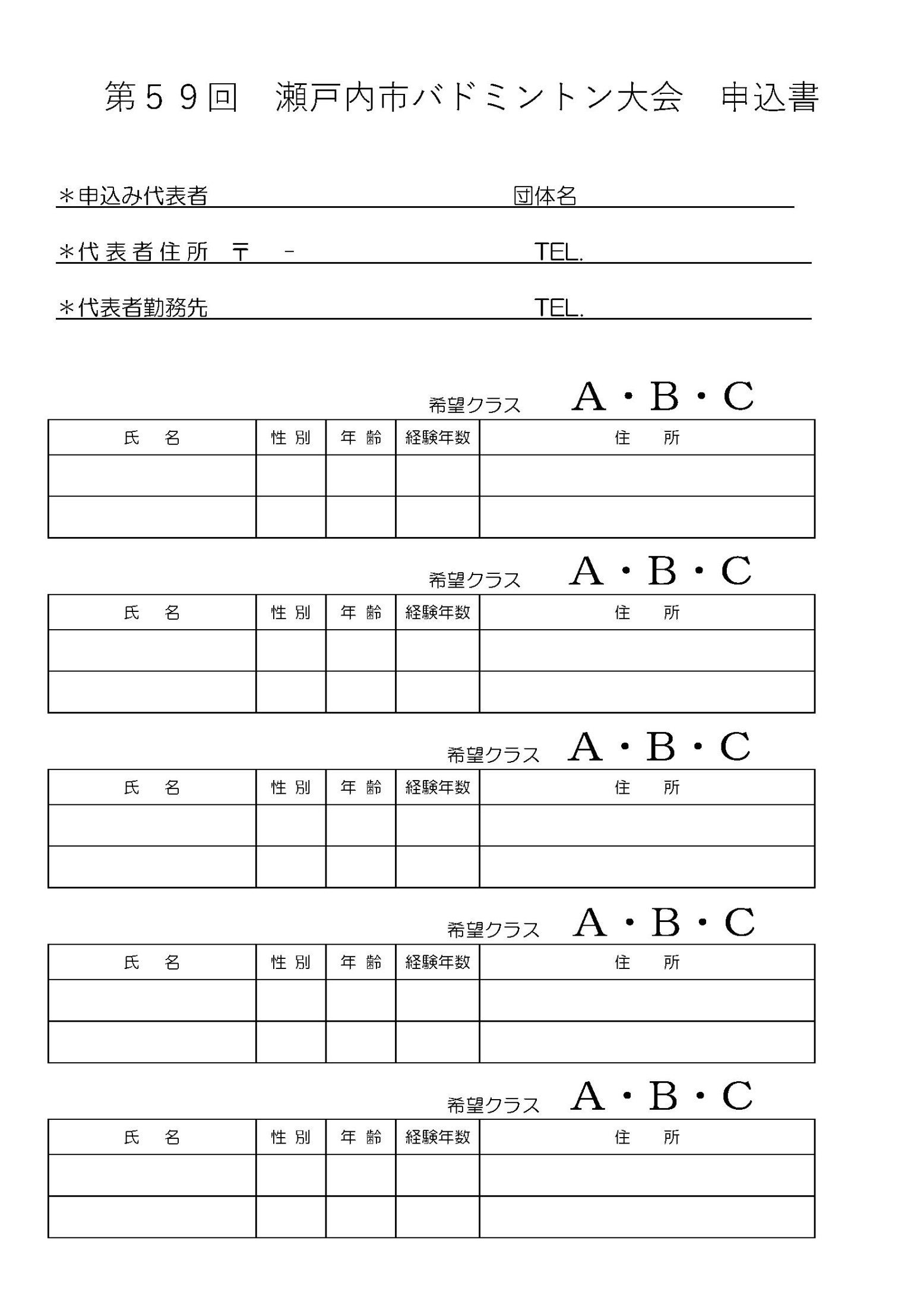 第59回瀬戸内市バドミントン大会の要項と申込書です。