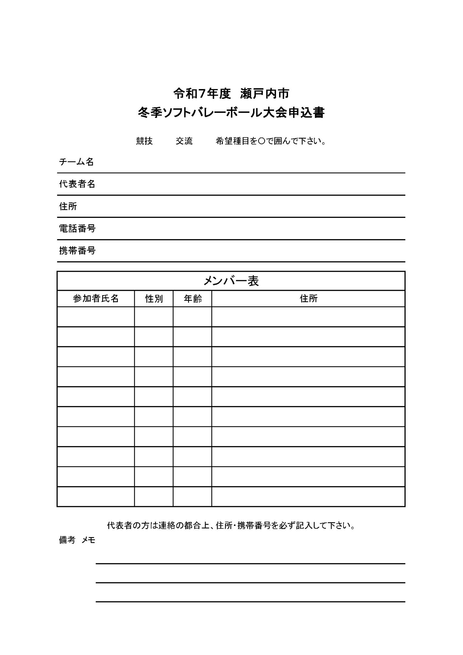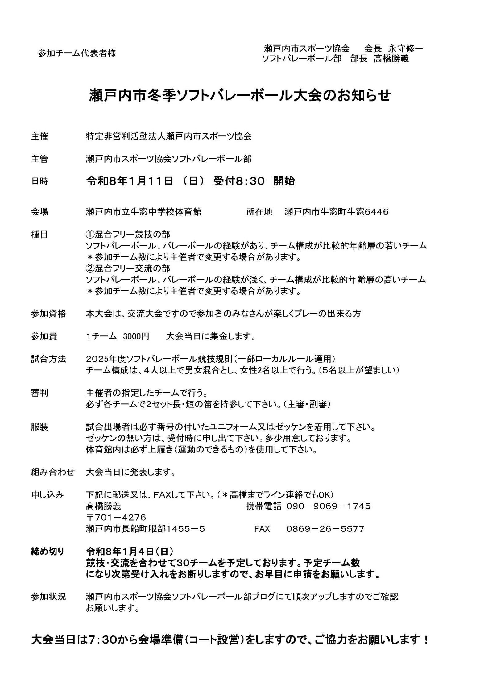 令和7年度瀬戸内市冬季ソフトバレーボール大会の要項、参加申込