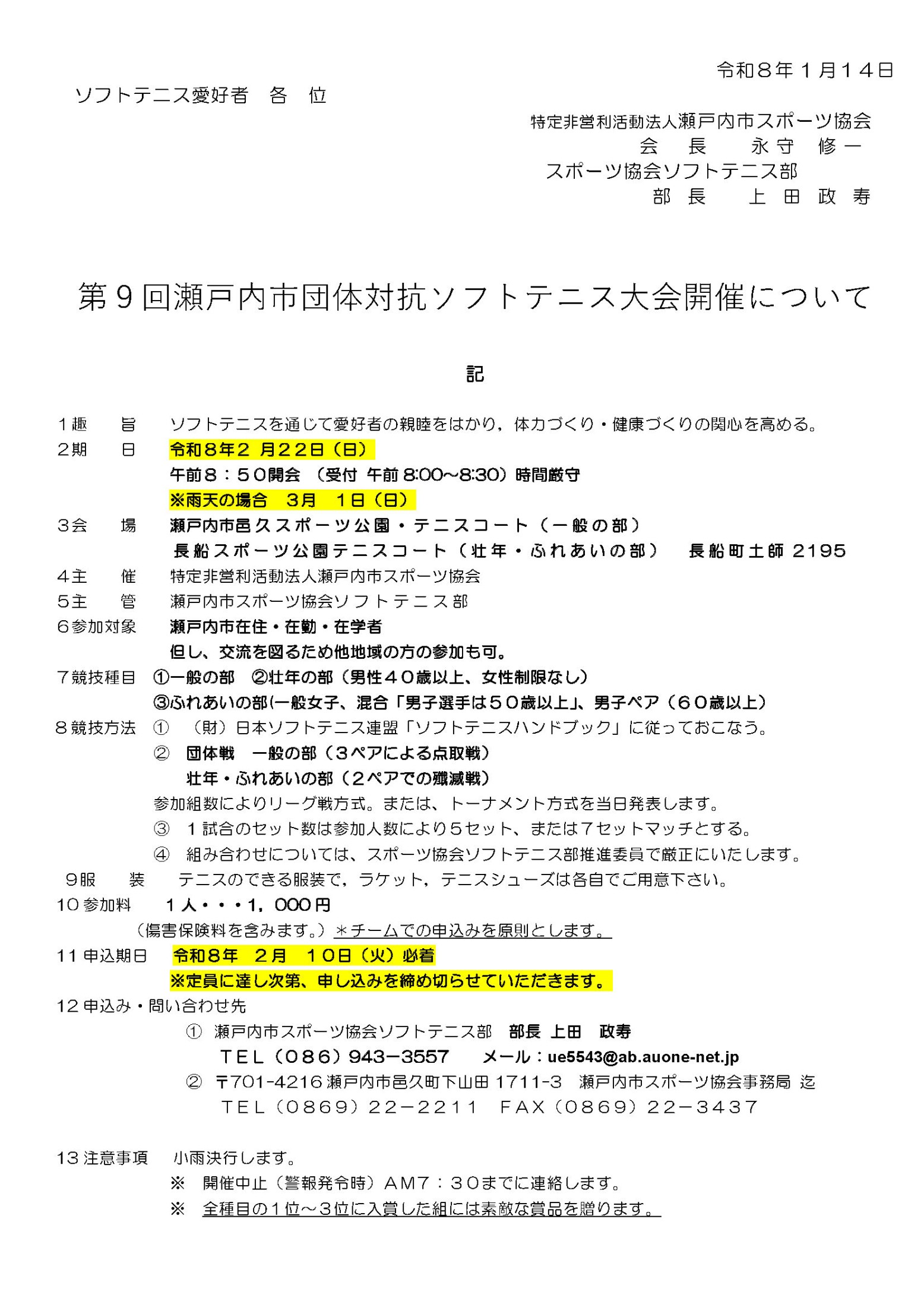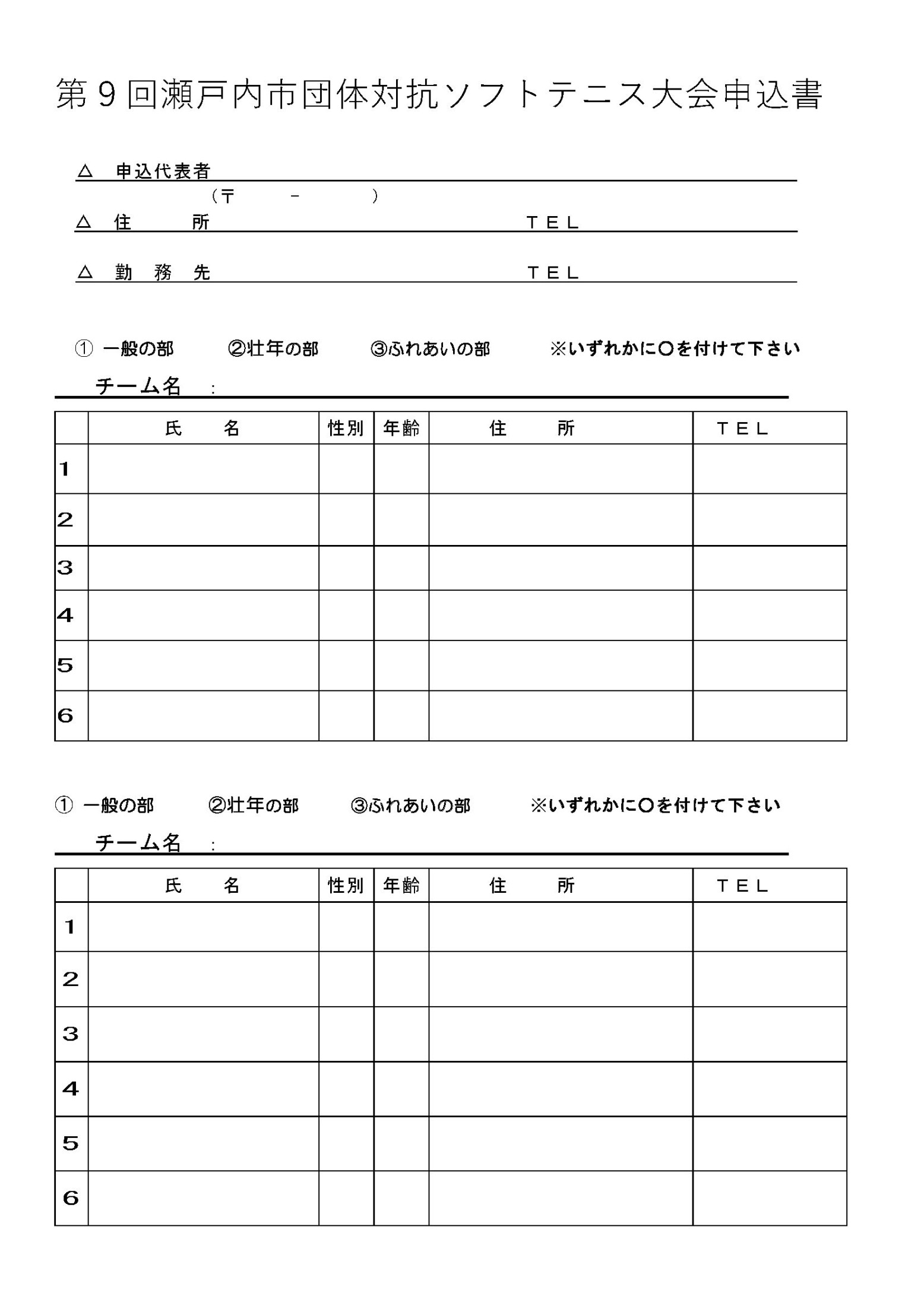 第9回瀬戸内市団体対抗ソフトテニス大会の要項、大会申込書