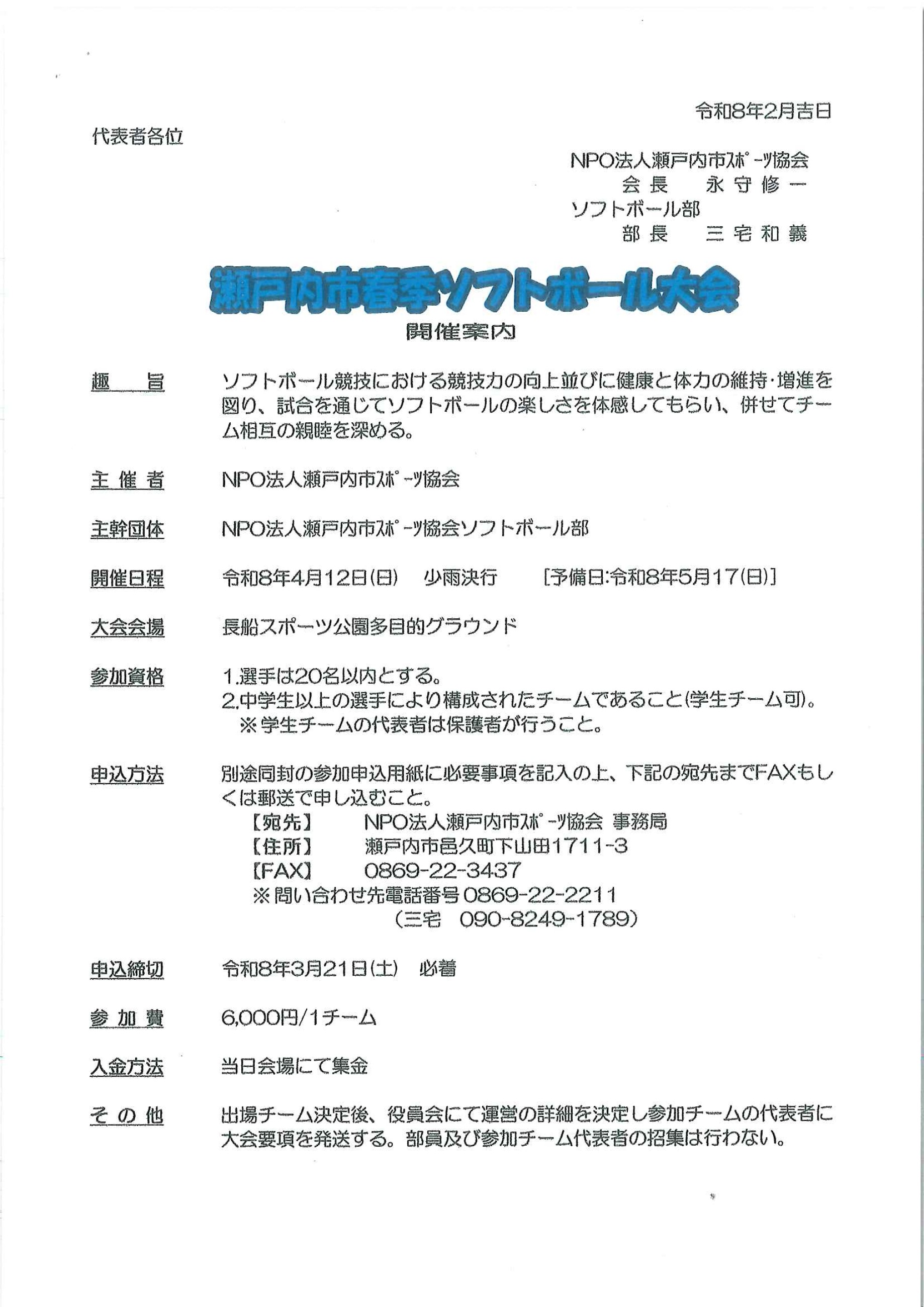 令和8年度瀬戸内市春季ソフトボール大会の案内