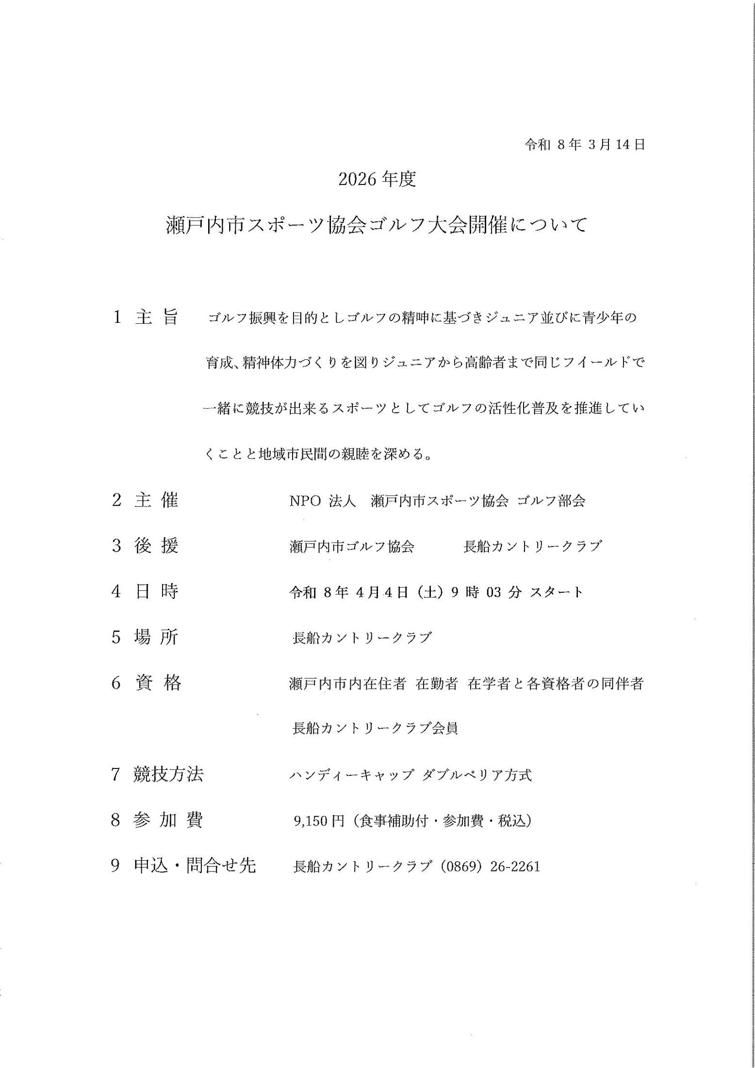 令和8年4月体協ゴルフ大会開催要項です。