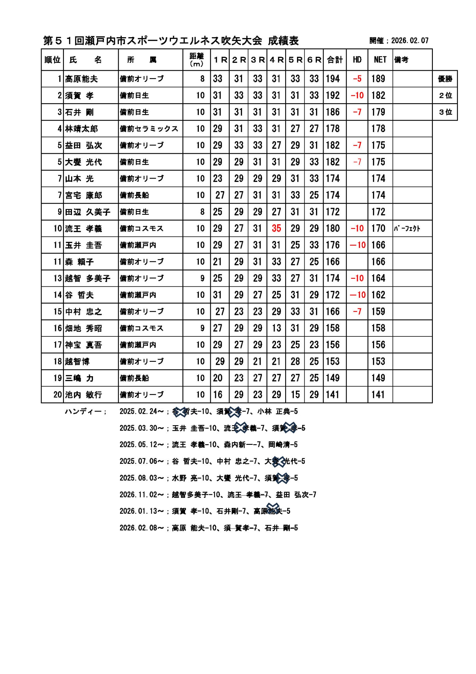 第51回瀬戸内市スポーツウエルネス吹矢大会 成績表